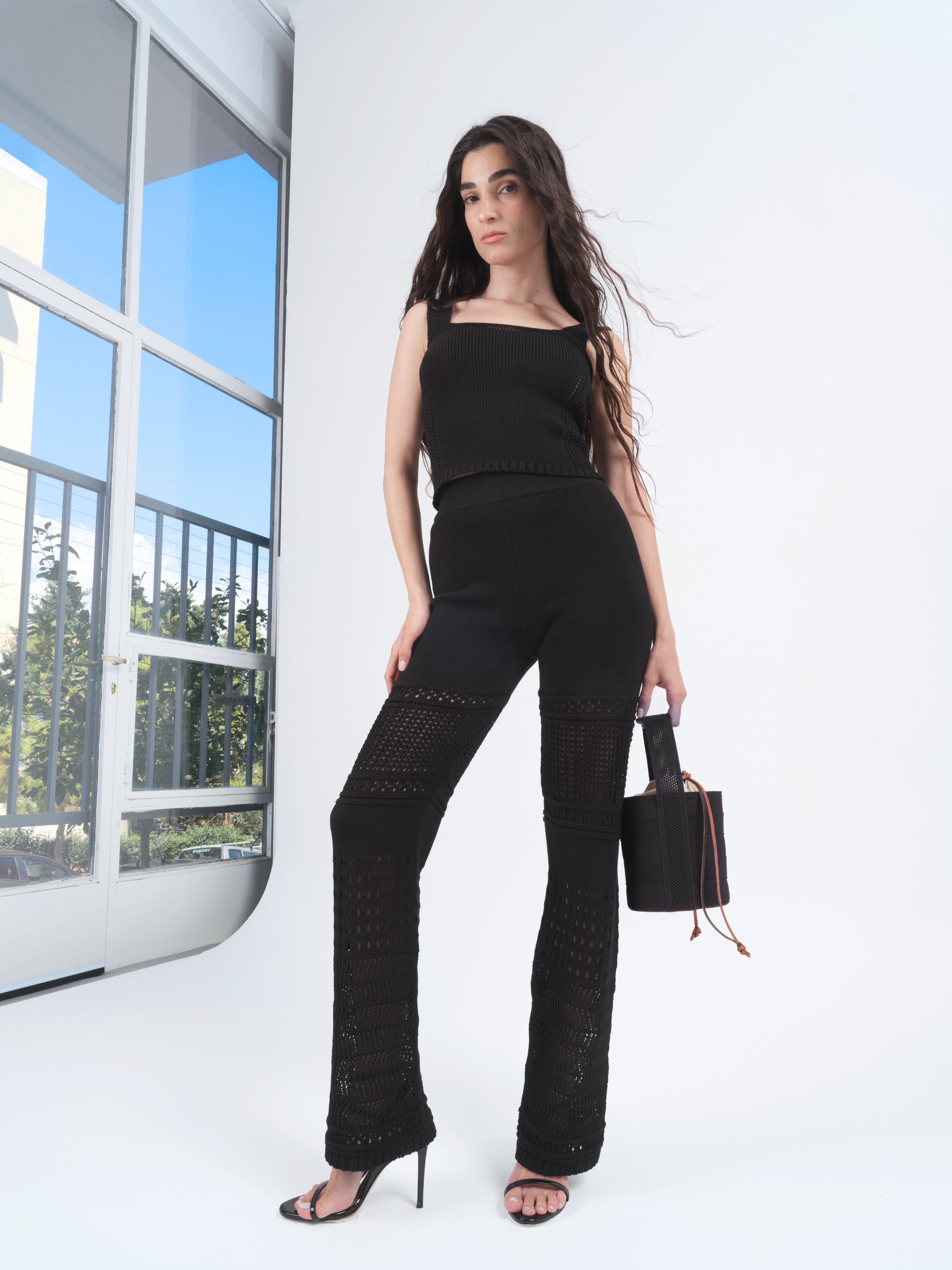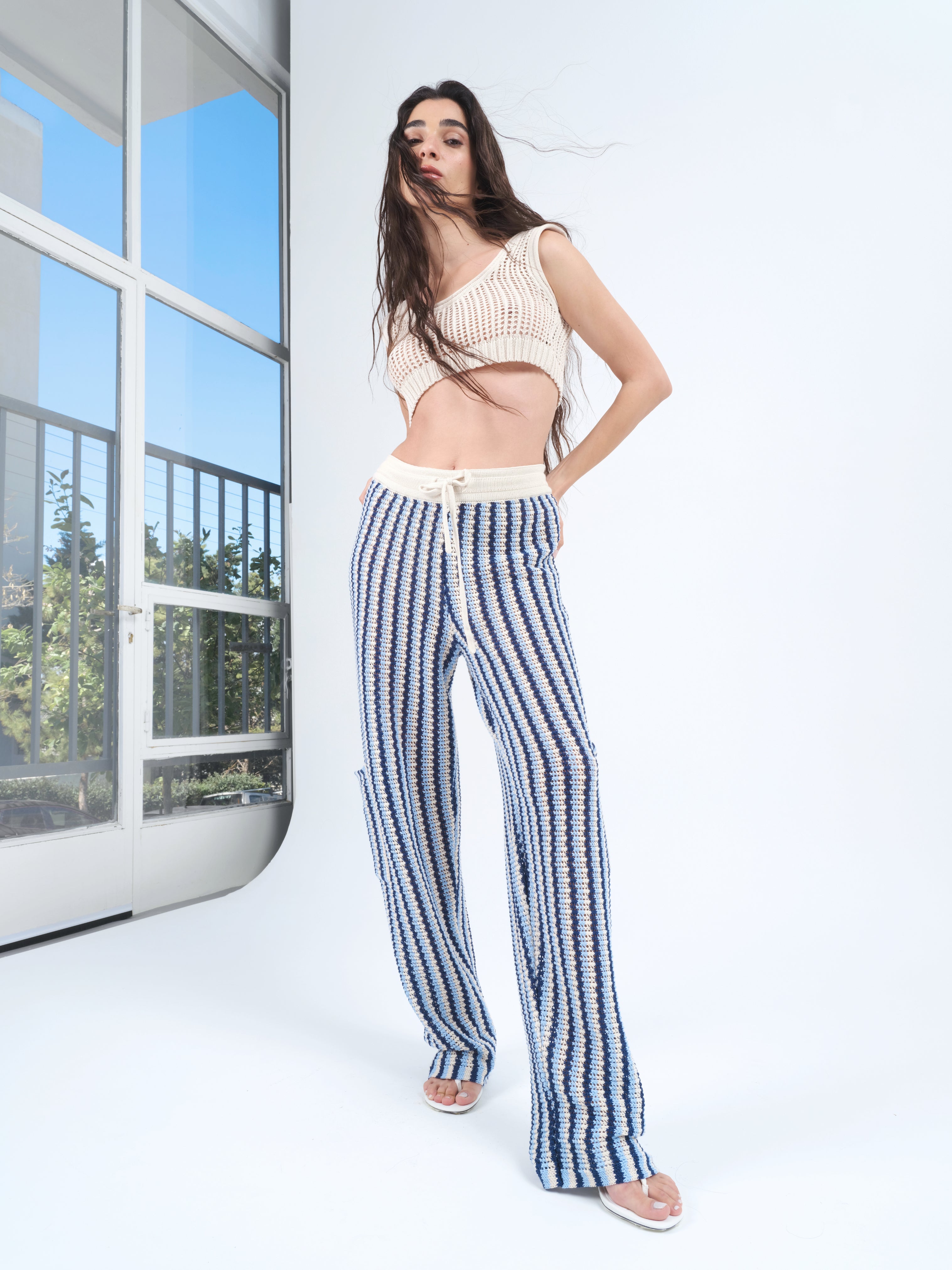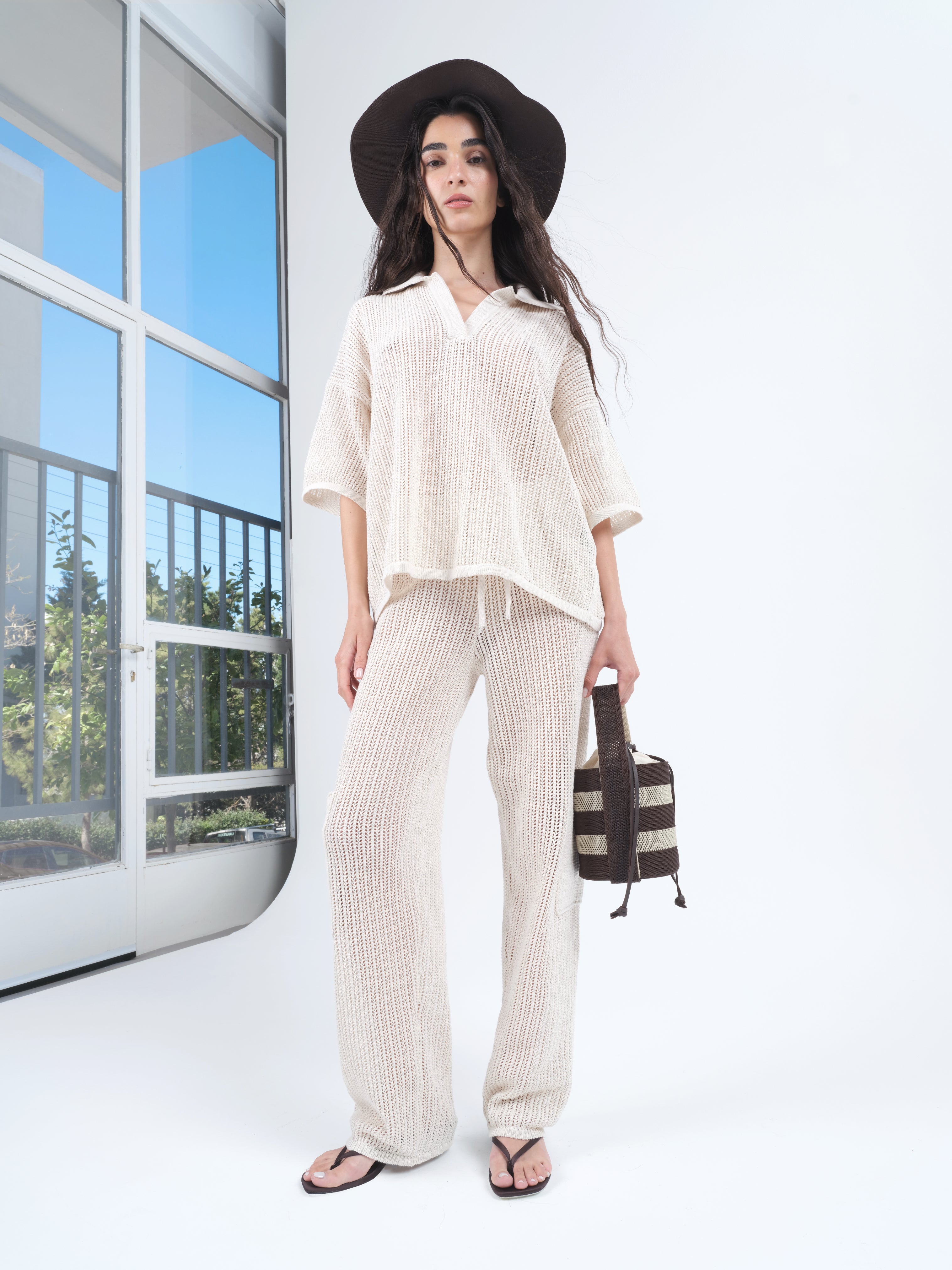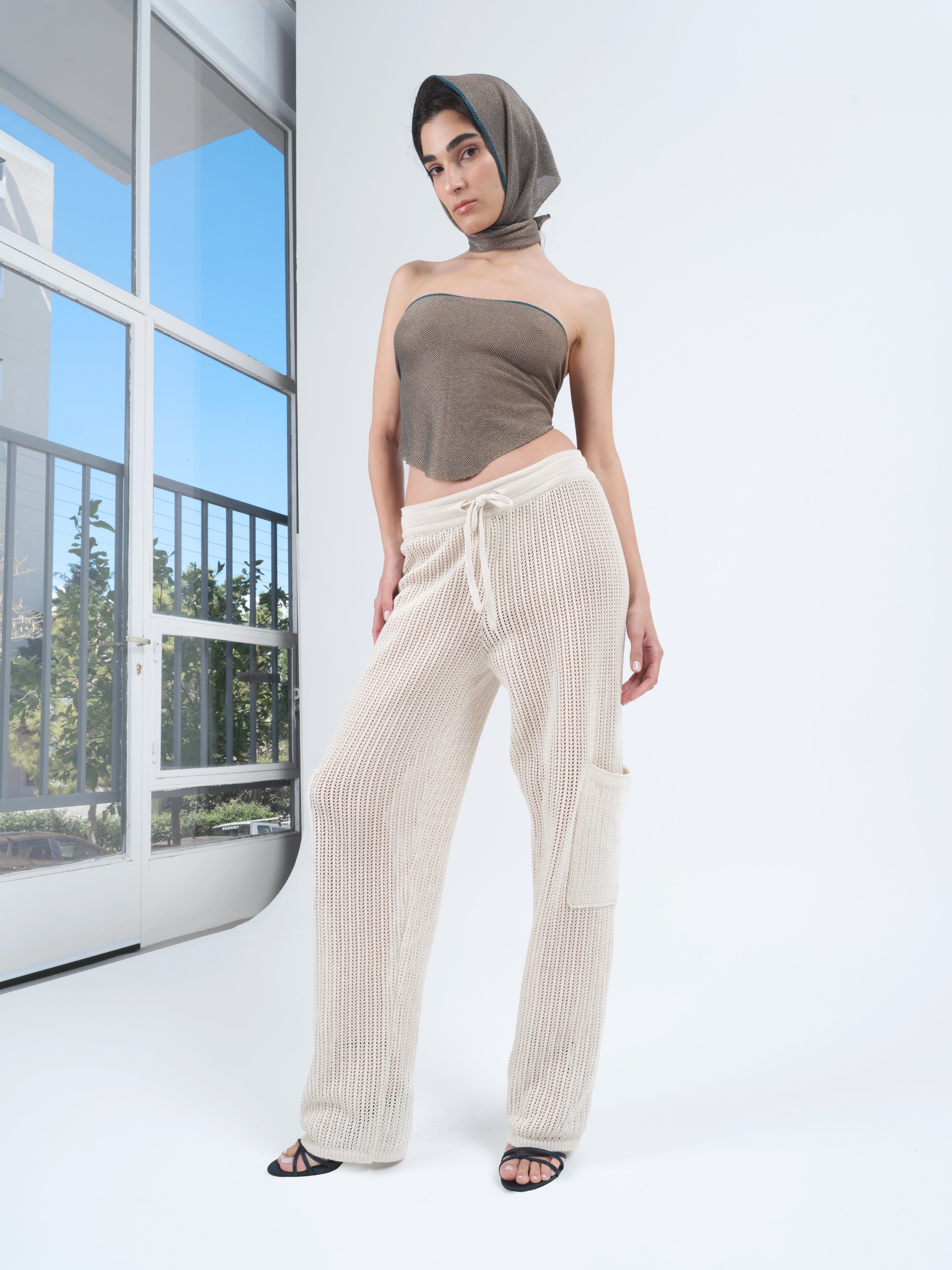 Softness is reimagined through structured openwork, set against the raw simplicity of organic cotton .