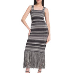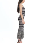 Knitted Maxi Dress crafted from 100% organic cotton for a soft, breathable feel. Designed with an elasticated fit that hugs the body, it features ribbed straps and delicate lace stitch detailing along the sides. Fringe trim along the hem adds movement for a playful finish. Irregular stripes give a unique textured finish.